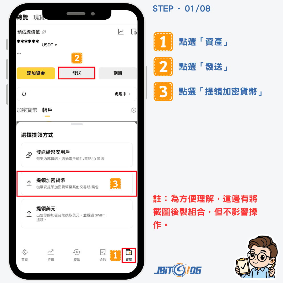 進入幣安交易所 APP 介面,依序點選「資產」、「發送」後,再點選「提領加密貨幣」。