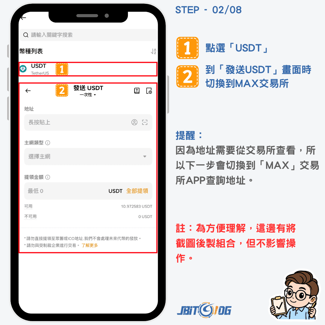 接著點選「USDT」,進入到「發送 USDT」畫面時,因為地址需要從交易所查看,所以接著會切換到「MAX」交易所 APP 查詢地址。