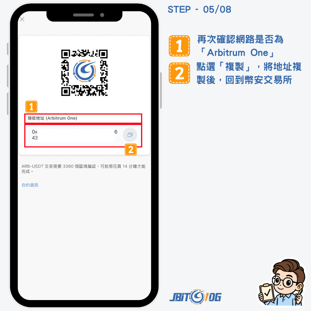 進入轉帳地址畫面後,請再次確認網路是否為「Arbitrum One」,如確認無誤,將下方地址複製後,回到幣安交易所。