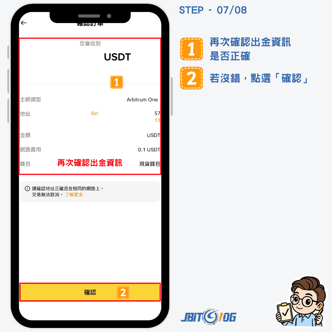 確認地址、網路是否正確,以及輸入想要轉到幣安交易所的金額後,按「送出」。最後再次確認出金資訊是否正確,如果沒錯的話,按「確認提領」就完成幣安的入金流程。