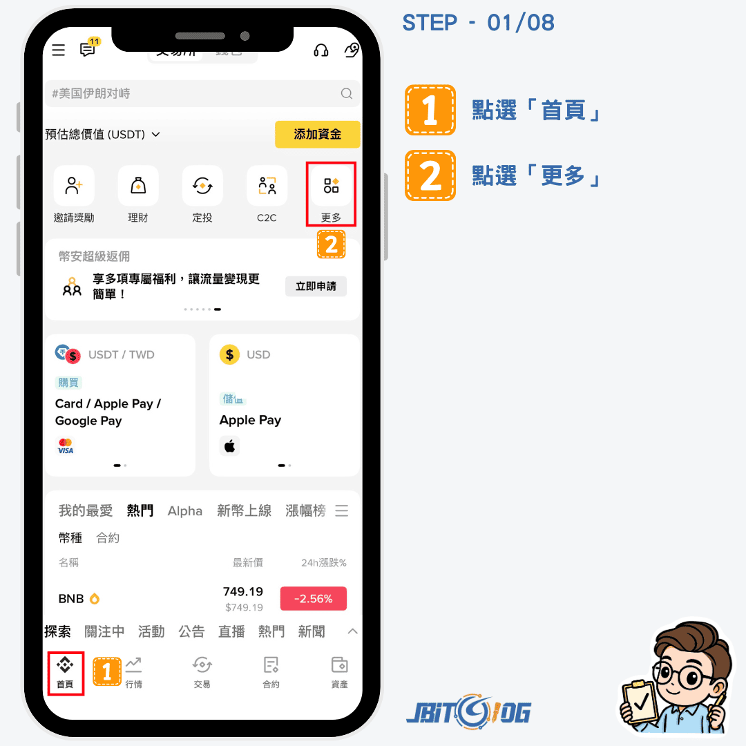 我們首先要將「穩定幣(USDT)」 換成「美元(USD)」,所以進入到幣安交易所介面後,點選頁面下方的「首頁」、「更多」後、接著點選「買/賣幣」。