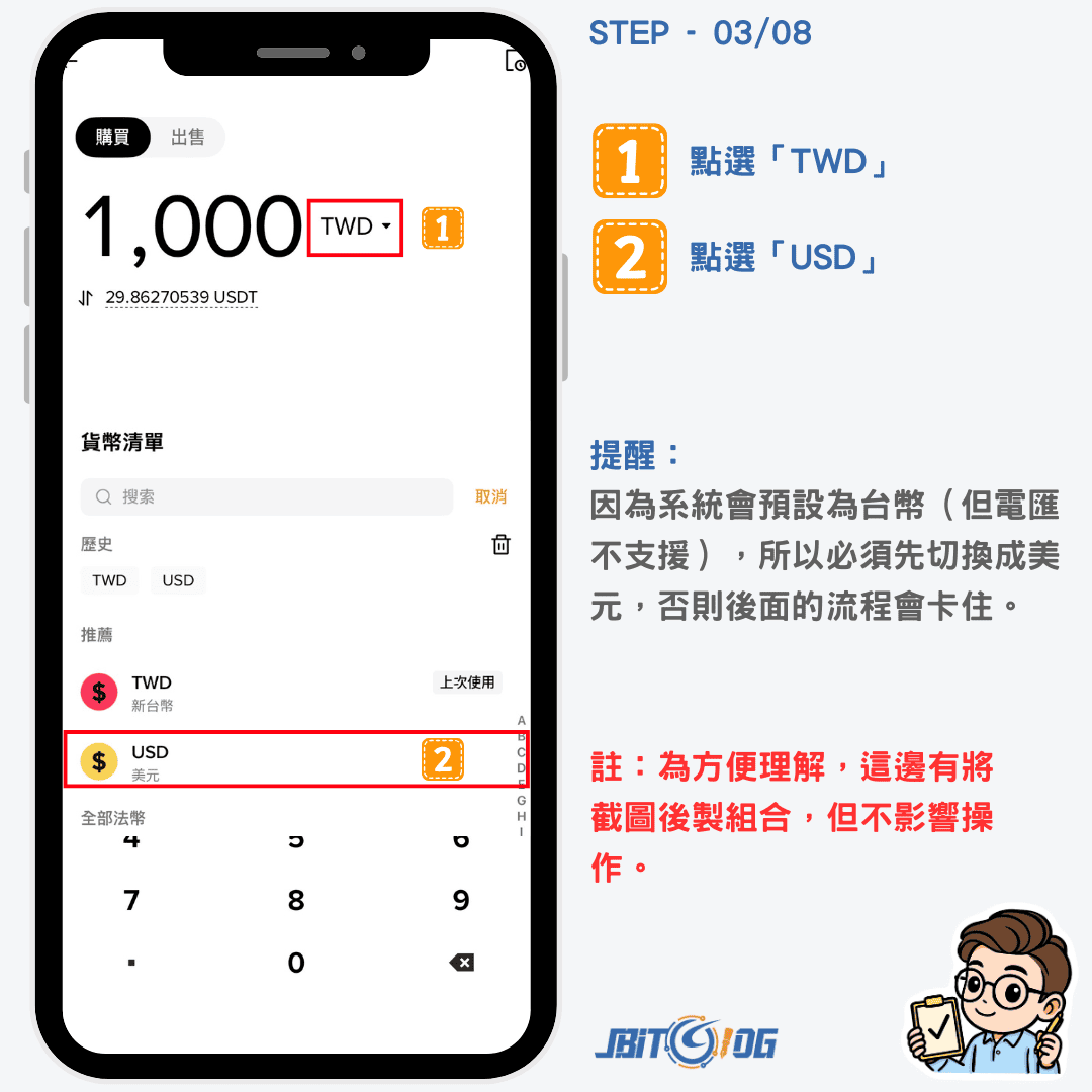 接著,因為系統會預設為台幣(但電匯不支援),所以必須先切換成美元,否則後面的流程會卡住。所以先點選「TWD」後,切換成「USD」。