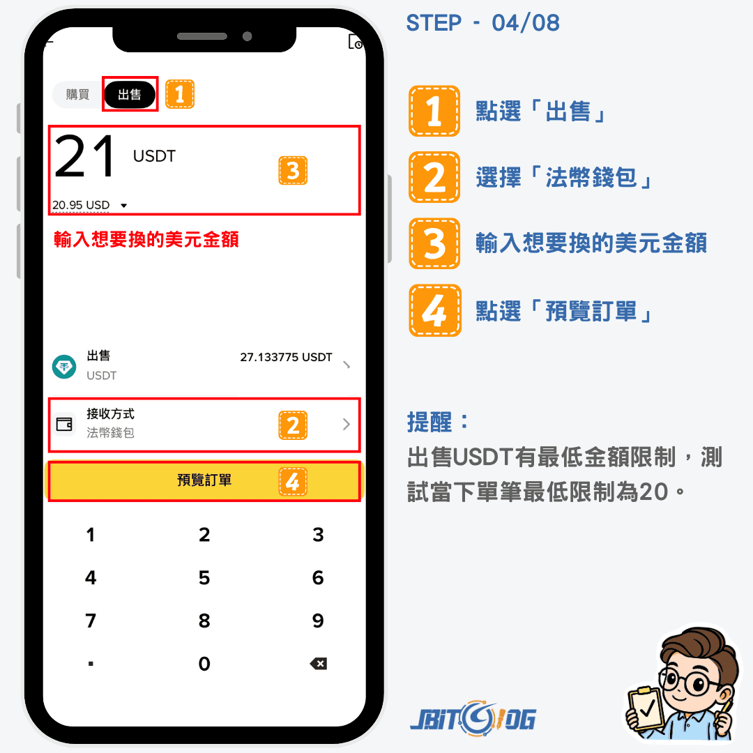 出售 USDT 有最低金額限制,測試當下,單筆最低限制金額為「20 USDT」。