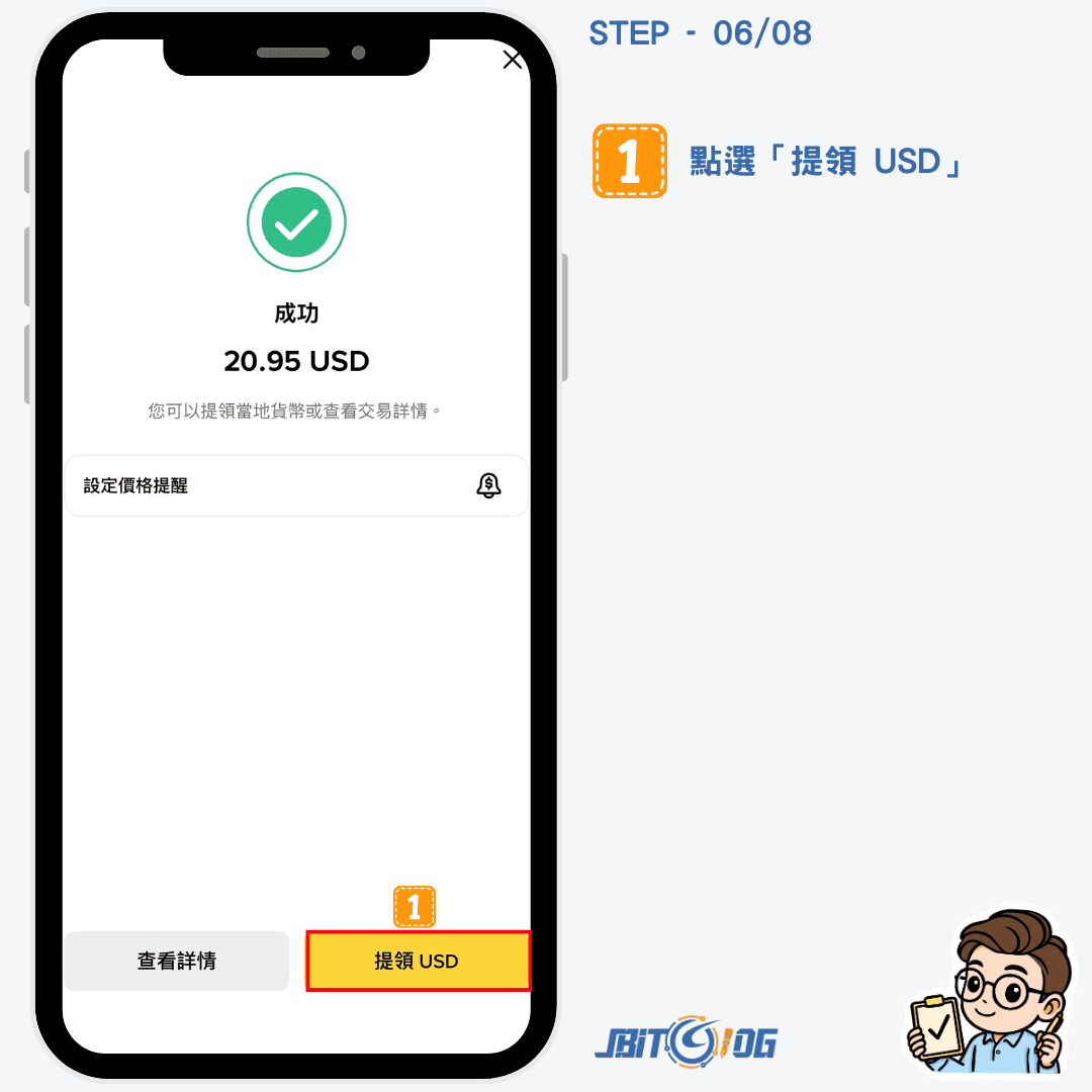 確認交易資是否正確後,點選「確認」。接著看到交易成功的畫面後,在點選「提領 USD」。