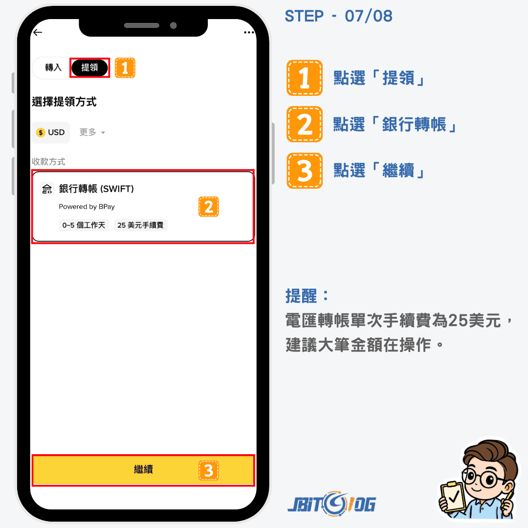 先點選上方的「提領」,並選擇「銀行轉帳(SWIFT)」,再點選「繼續」。