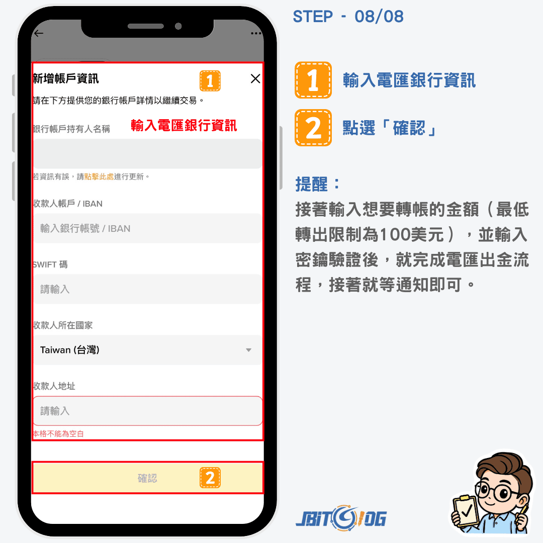 下一步輸入自己的收款銀行資料,輸入完成後點選「確認」,然後在輸入想要轉出的金額、密鑰驗證後,就完成電匯出金流程,接著就等通知即可。
