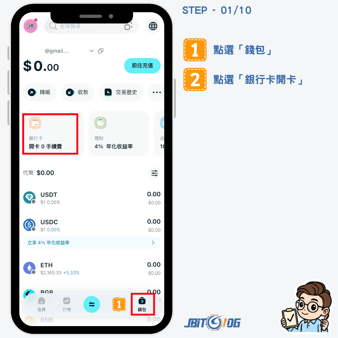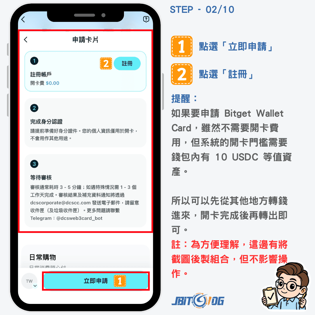 如果要申請 Bitget Wallet Card,雖然不需要開卡費用,但系統的開卡門檻需要錢包內有 10 USDC 等值資產。所以可以先從其他地方轉錢進來,開卡完成後再轉出即可。