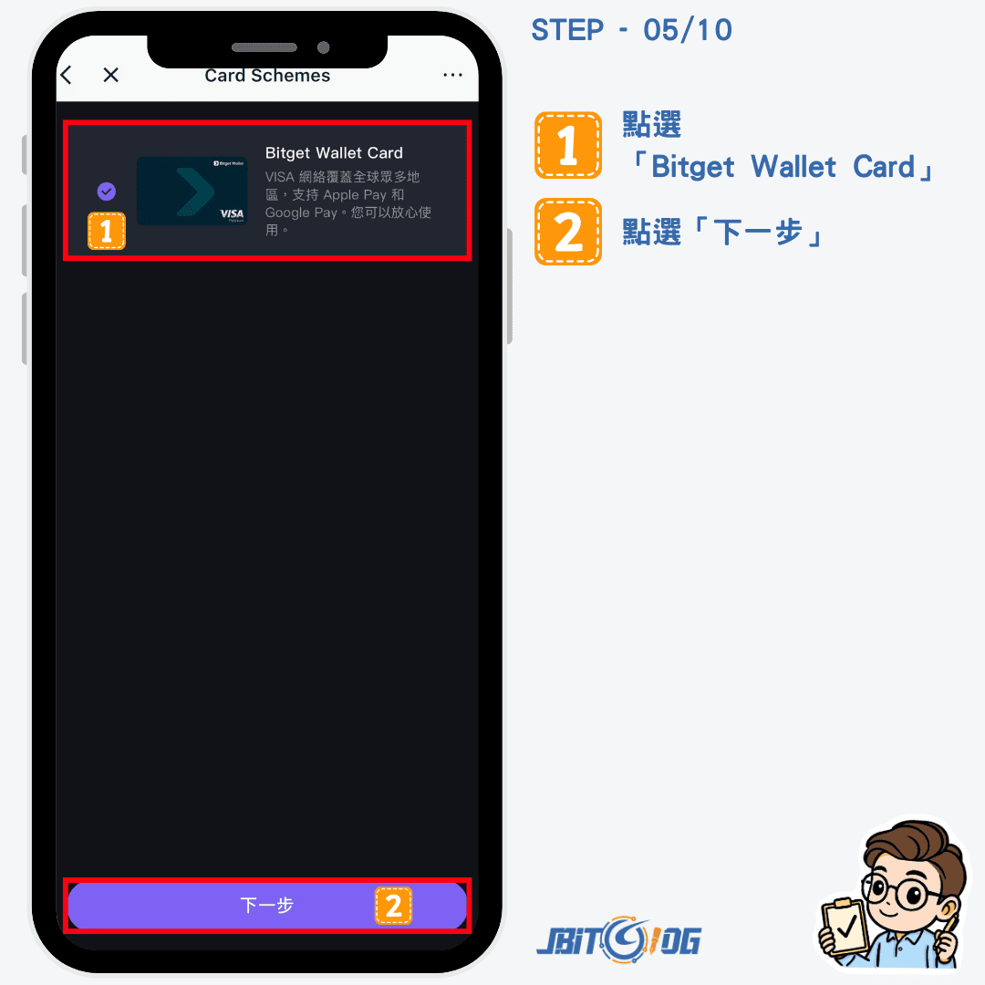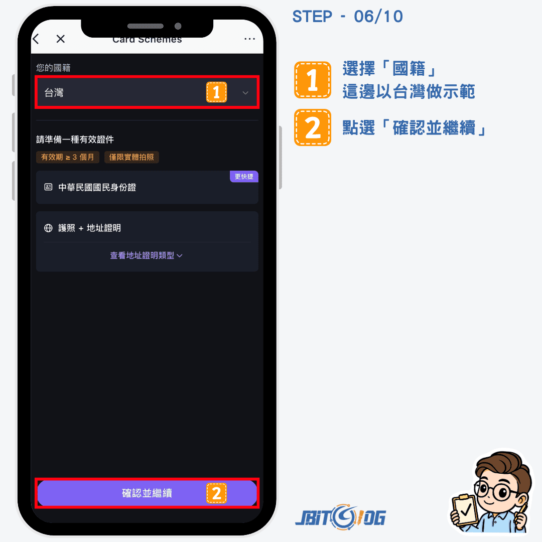 選擇「Bitget Wallet Card」後,點選「下一步」。接著選擇「國籍」,這邊以「台灣」做示範,然後點選「確認並繼續」。