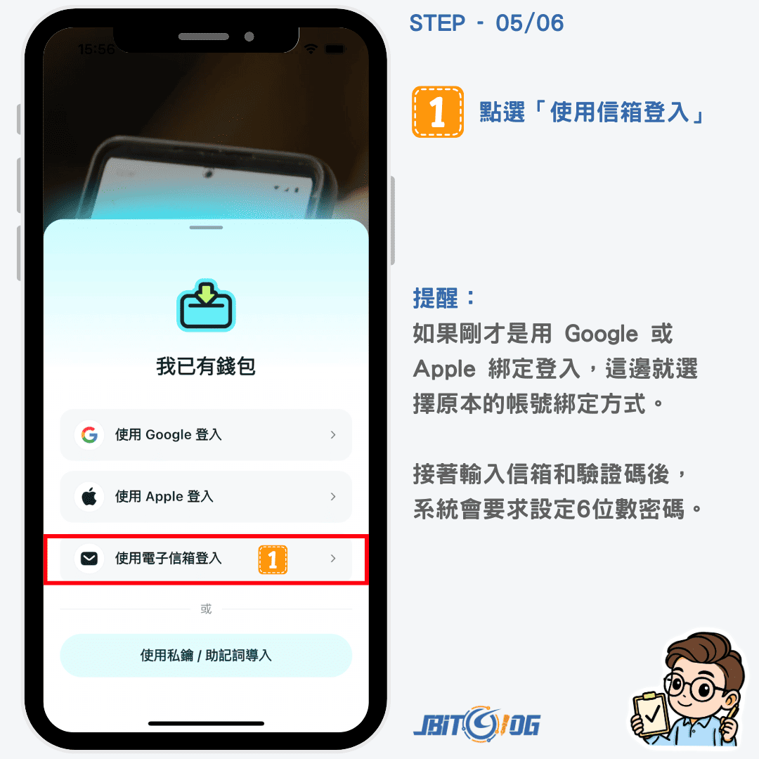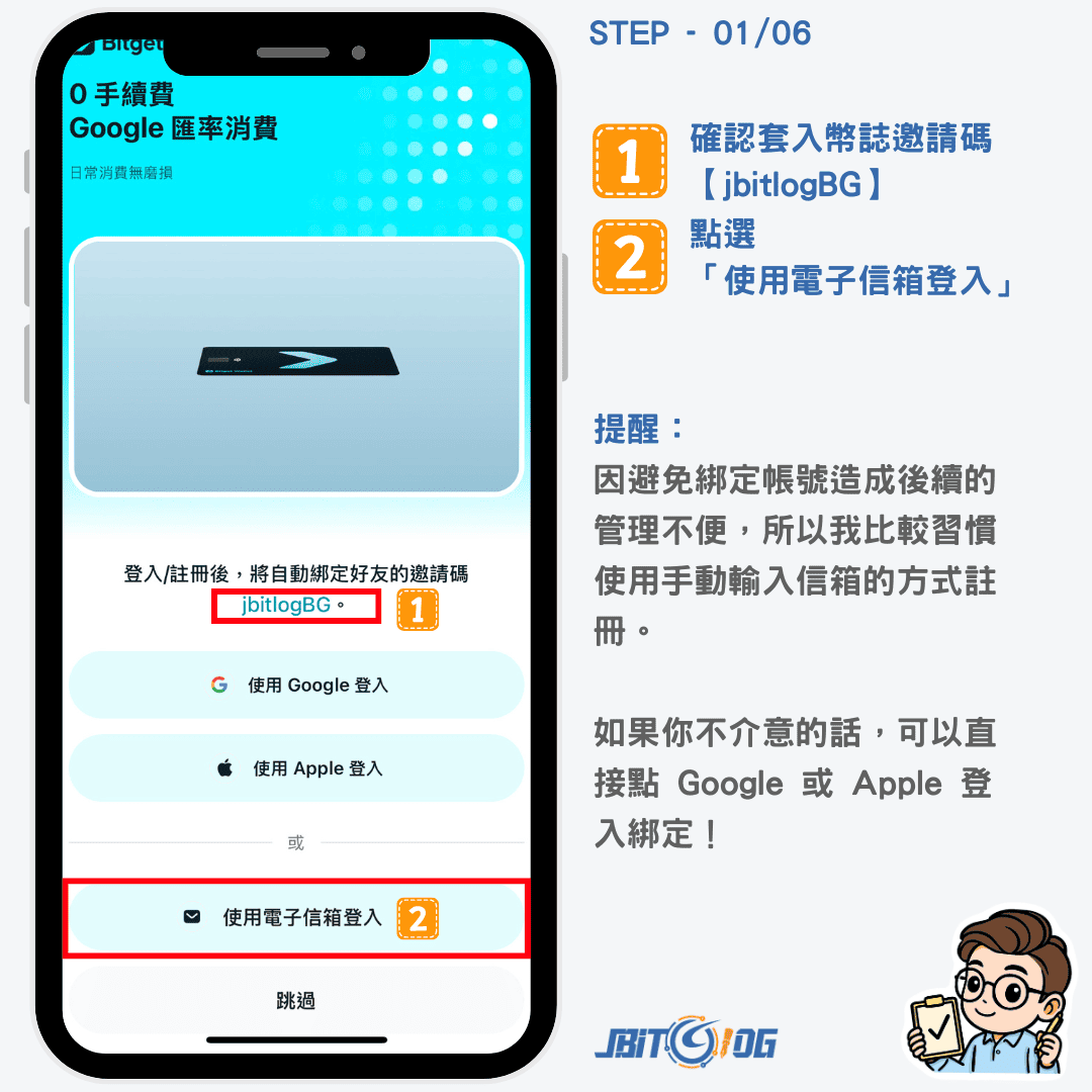 點 Bitget Wallet 註冊網址,確認已套入幣誌邀請碼【jbitlogBG】後,點選「使用電子信箱登入」。