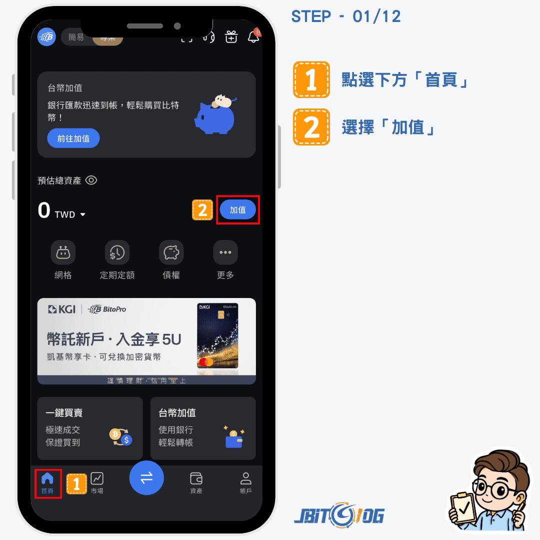 首先進入幣託交易所 APP 後,點選畫面下方的「首頁」後,選擇「加值」。