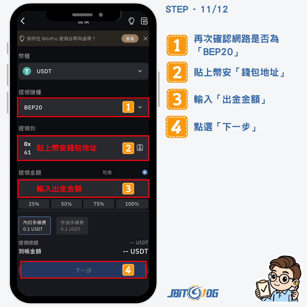 回到幣託交易所 APP 後,先確認區塊鏈網路是否為「BEP20」,接著依序貼上幣安的「錢包地址」、輸入「出金金額」後,點選「下一步」。