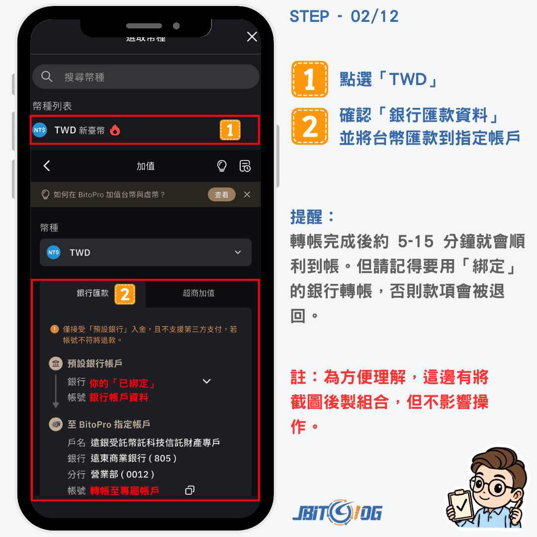 接著選擇「TWD」後,確認幣託的「銀行匯款資料」沒問題後,接著將台幣匯款到指定帳戶就完成入金。