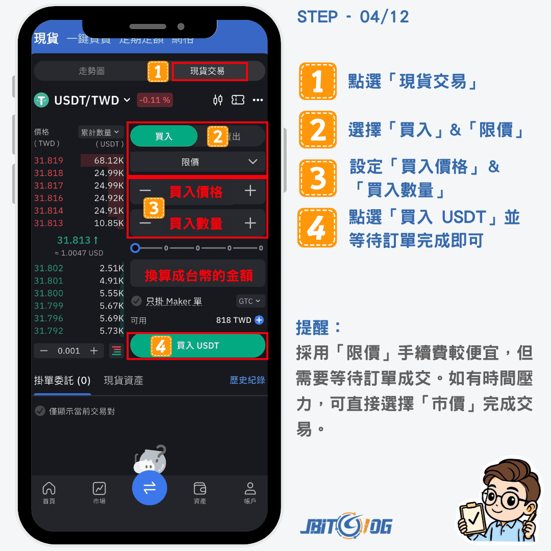 然後點選「現貨交易」,並選擇「買入」和「限價」後,設定想要的「買入數量」和「買入價格」,再點選「買入 USDT」並等待訂單完成就好。