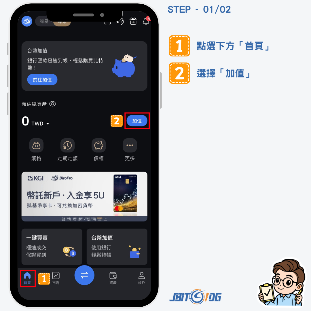 首先進入幣託交易所 APP 後,點選畫面下方的「首頁」後,選擇「加值」。
