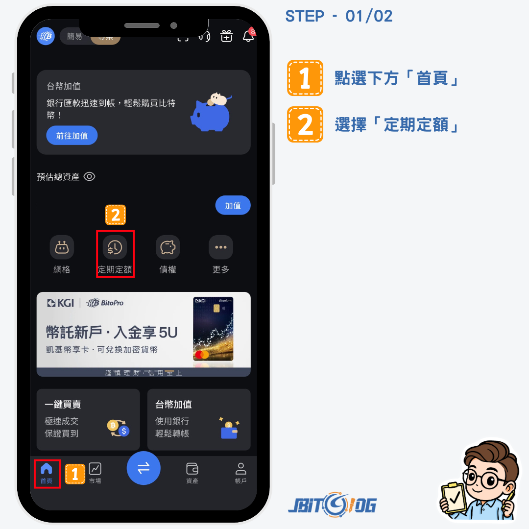 具體操作如下圖所示,首先進入幣託交易所 APP,點選畫面下方的「首頁」後,選擇「定期定額」。