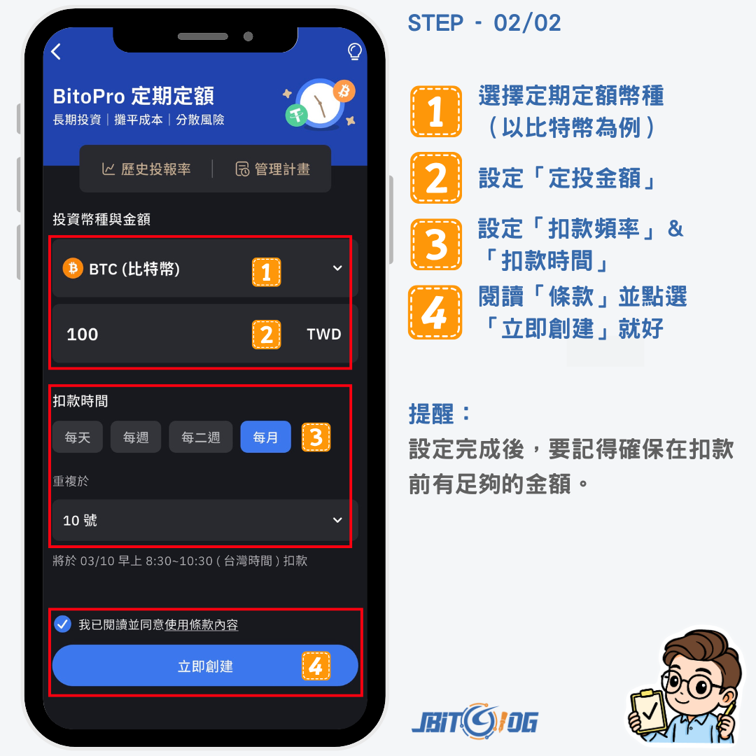 接著選擇幣種(以比特幣為例)後,設定「定投金額」、「扣款頻率」和「扣款時間」,最後閱讀並勾選「條款」,在點選「立即創建」就設定完成。