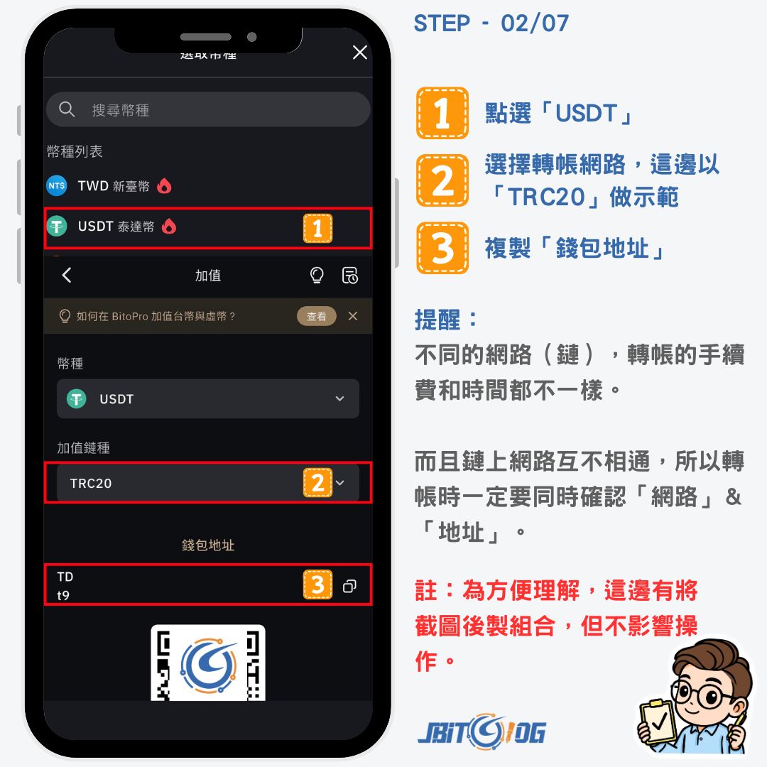 接著選擇「USDT」後,選擇轉帳網路,這邊以「TRC20」做示範,最後再將「錢包地址」複製。