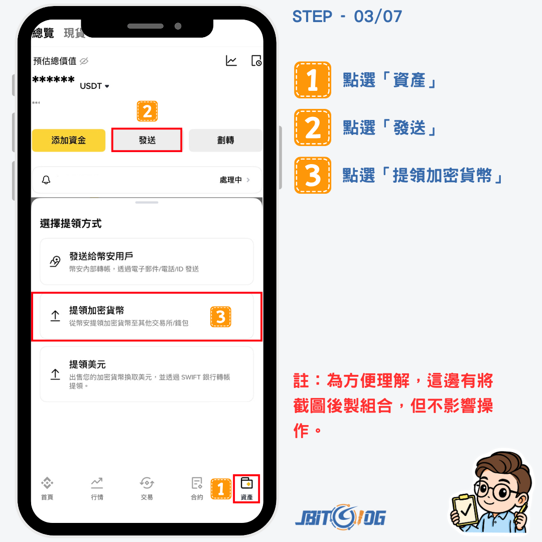 切換到幣安交易所 APP 後,點選畫面下方的「資產」,然後點選「發送」、「提領加密貨幣」,並且再選擇「USDT」。