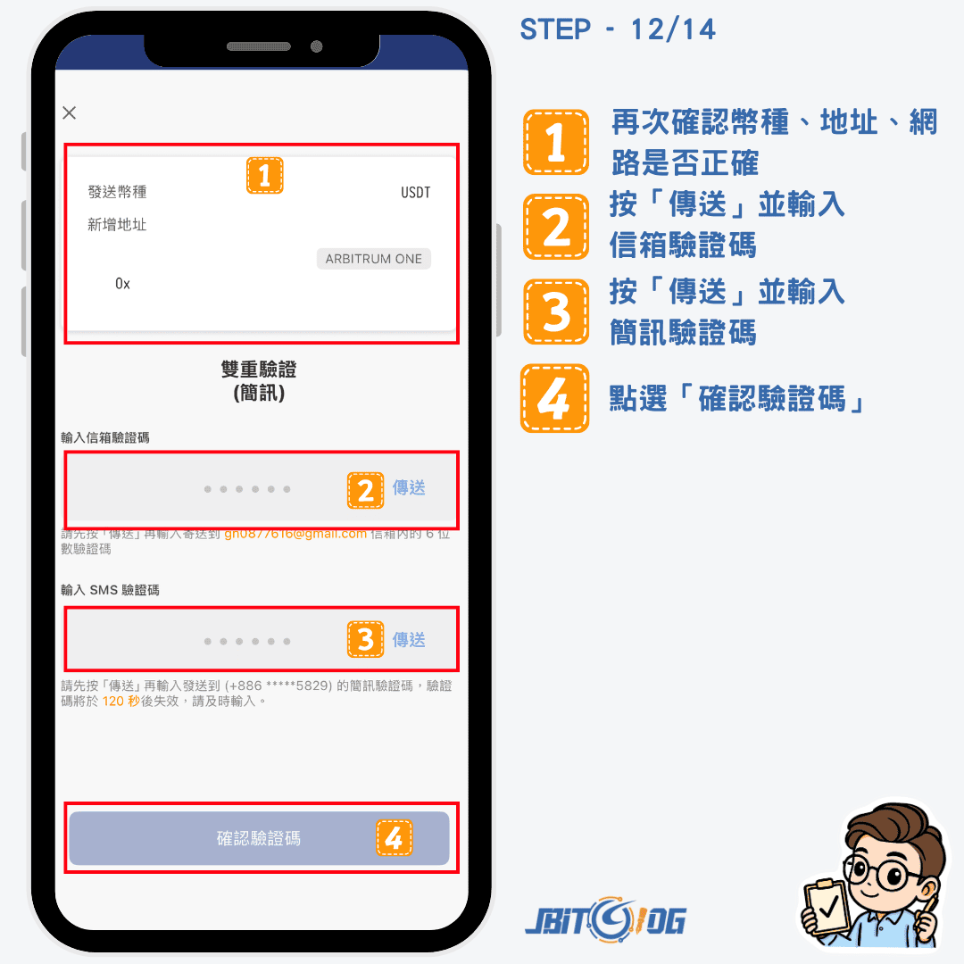 接著再次確認幣種、地址、網路是否正確,沒錯的話,點「傳送」後,依序輸入信箱和簡訊驗證碼,再點「確認驗證碼」。