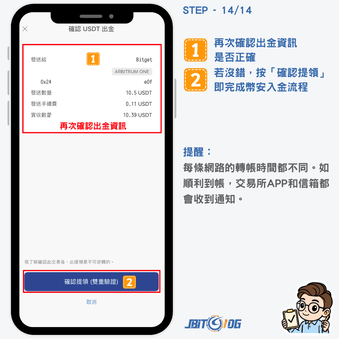 確認地址、網路是否正確,以及輸入想要轉到幣安交易所的金額後,按「送出」。最後再次確認出金資訊是否正確,如果沒錯的話,按「確認提領」就完成幣安的入金流程。