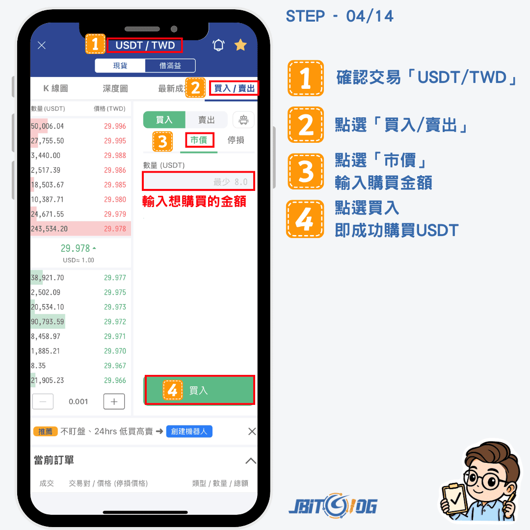 下一步,確認交易對是「USDT/TWD」後,點「買入/賣出」、選「市價」、輸入想要購買的美元穩定幣數量後,點選「買入」,即成功購買美元穩定幣。