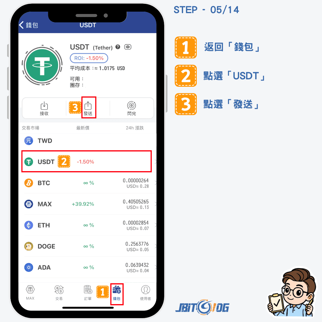 當穩定幣購買完成後,返回「錢包」,此時台幣都會轉成 USDT。接著選擇 USDT、點選「發送」,會進入到發送地址的頁面。