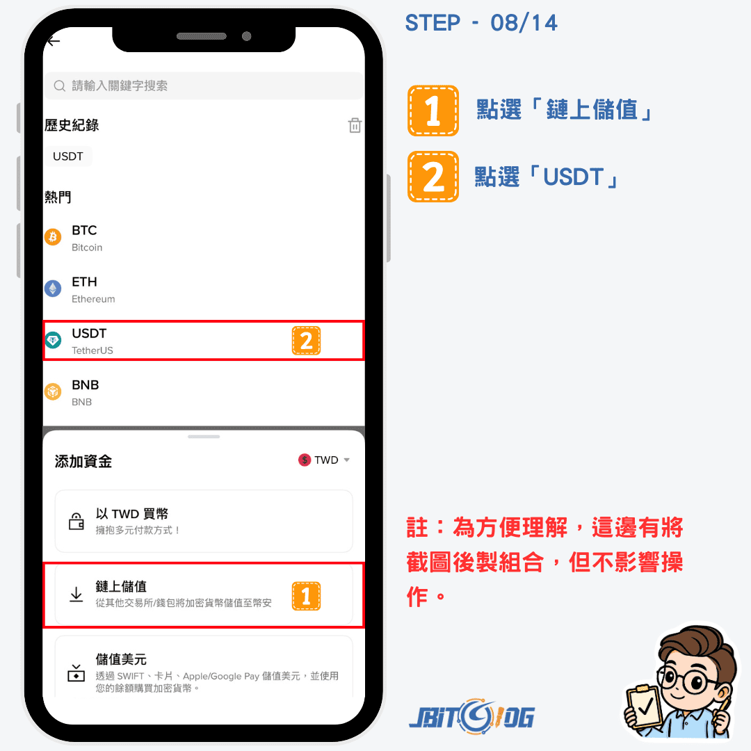 切換到「幣安」交易所後,點選頁面下方的「資產」,並點選「添加資金」。接著選擇「鏈上儲值」後,在點選「USDT」。