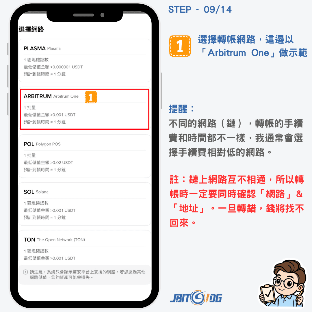 - 不同的網路(鏈),轉帳的手續費和時間都不一樣,我通常會選擇手續費相對低的網路。