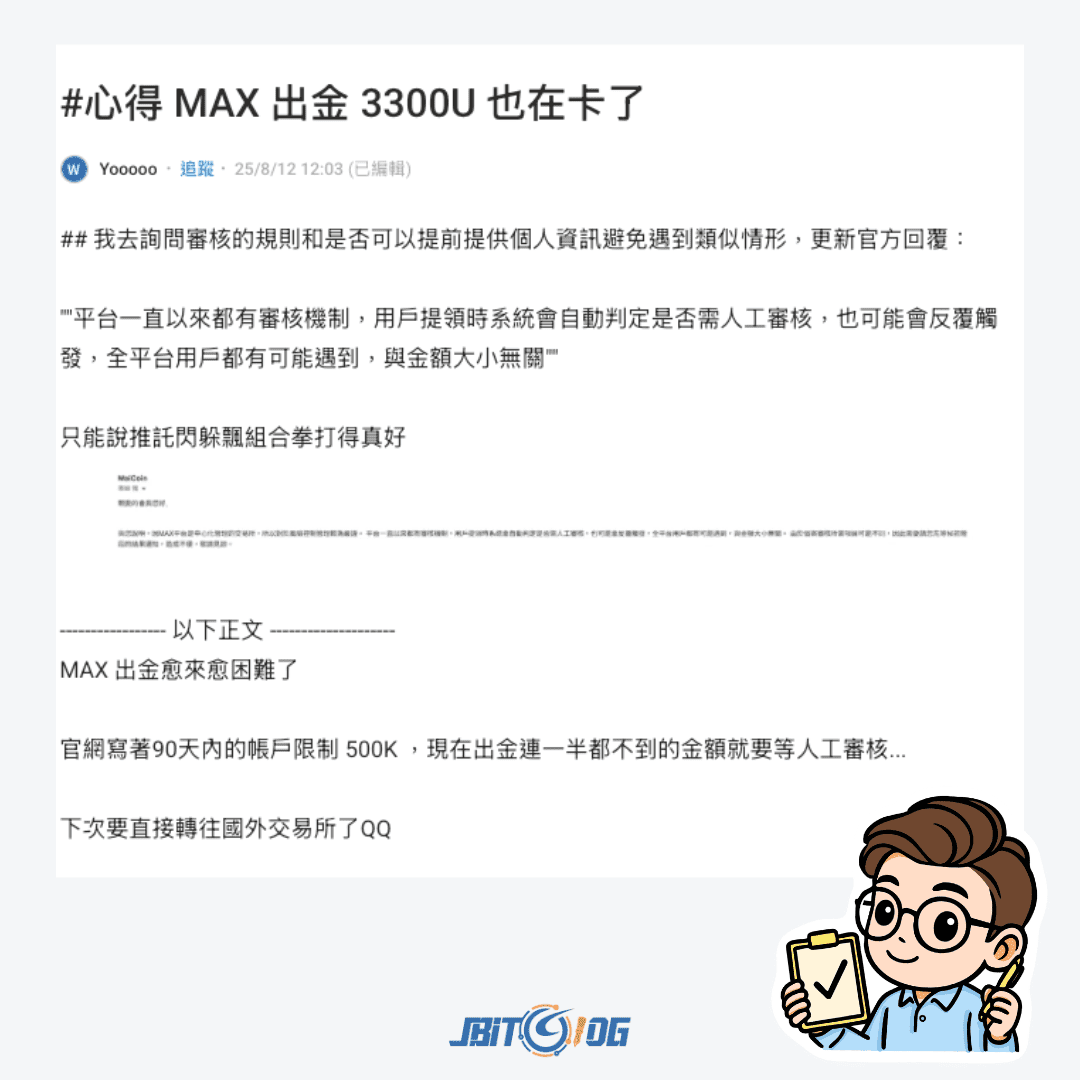 但另一方面,「風控機制容易觸發」、「資金卡住」、「人工審核時間較長」也確實是反覆被提及的問題。這些負面評價,並不一定代表平台不安全,而是反映出 MAX 在合規與風險控管上採取相對保守的策略。