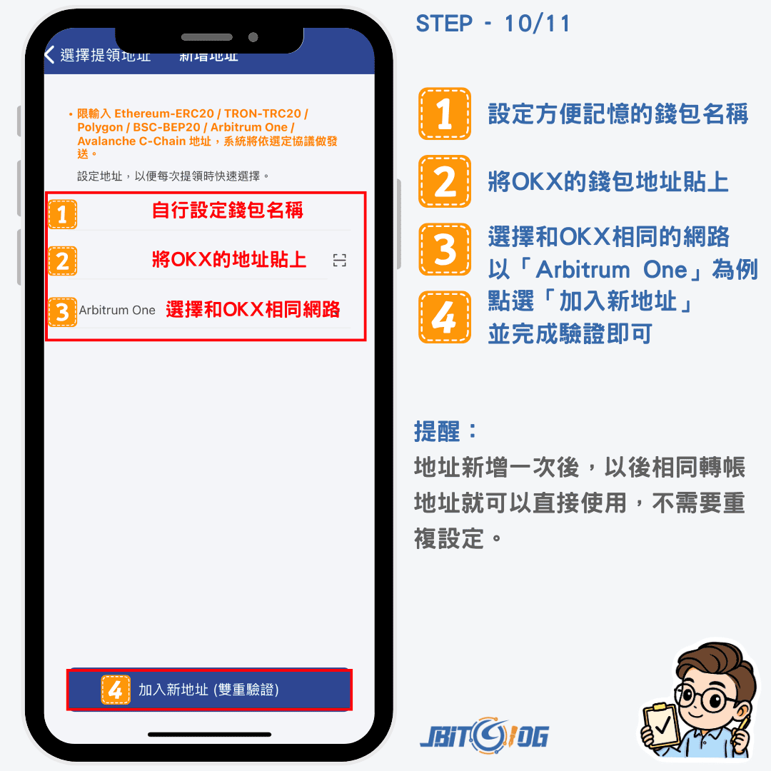 回到 MAX 交易所 APP 後,依序輸入方便記憶的錢包名稱、剛剛所複製的 OKX 錢包地址,以及轉帳網路「Arbitrum One」後,點選下方「加入新地址」,並完成雙重驗證後,錢包地址就新增完成。