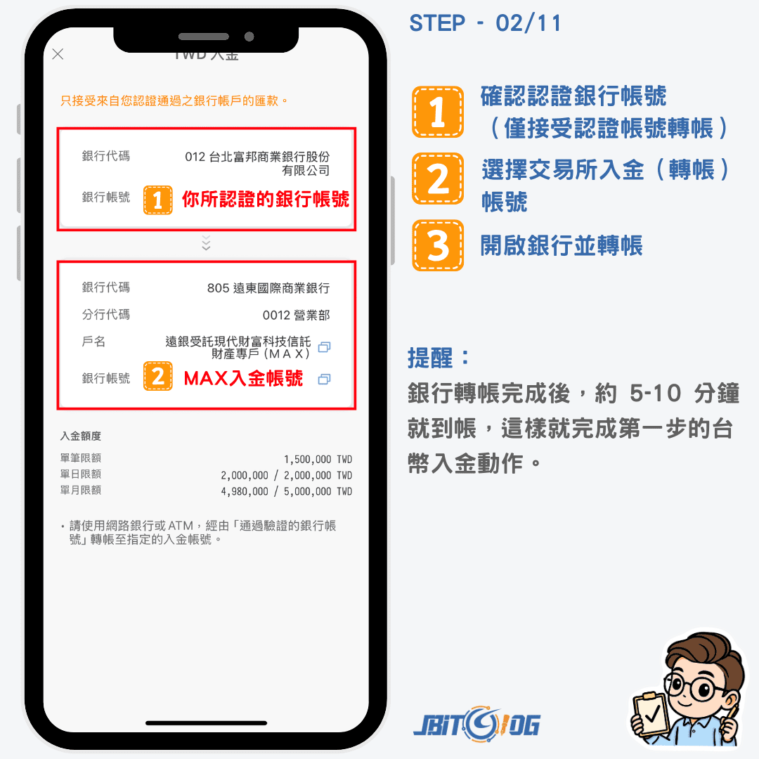 確認帳號沒問題後,直接透過已驗證的銀行帳戶,看想要入金多少錢,直接轉帳到 MAX 交易所即可,如果沒有轉錯帳號的話,大約 5 – 10 分就會完成入金。