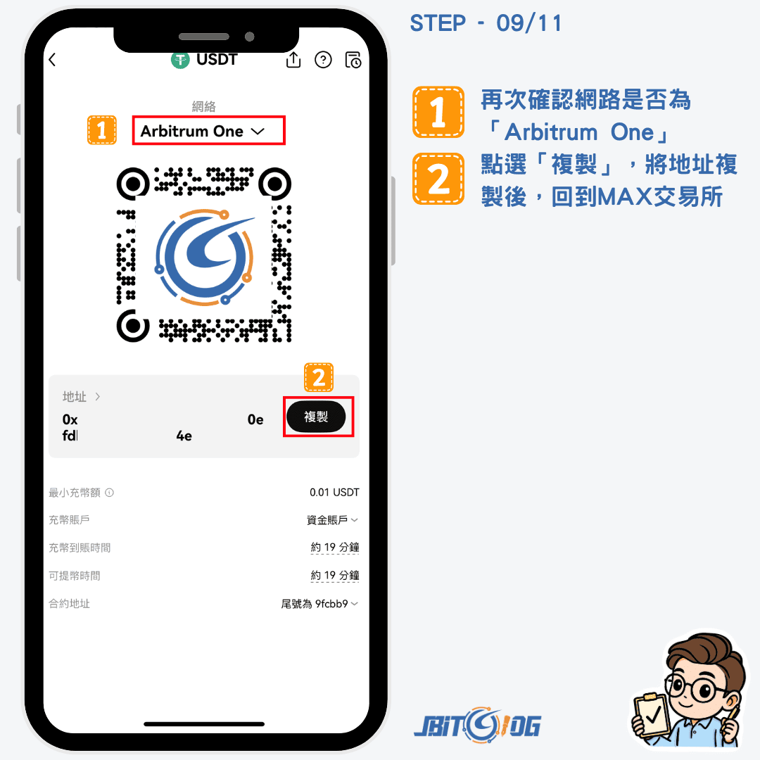 選擇好轉帳網路,並確認上方顯示的是「Arbitrum One」後點選「複製」,再切回 MAX 交易所 APP 新增地址。