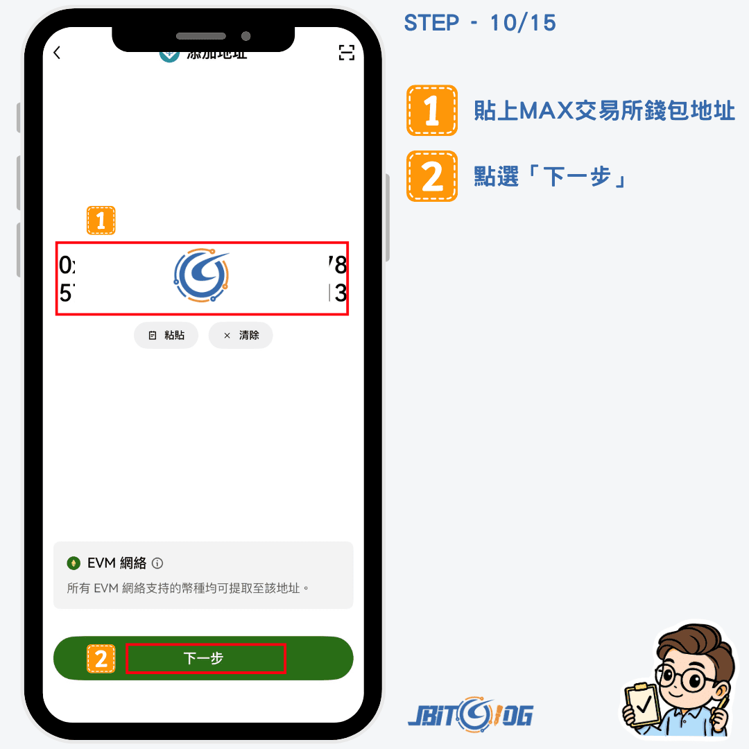 接著在 OKX 的添加地址畫面中,貼上 MAX 交易所的錢包地址,並點選「下一步」。
