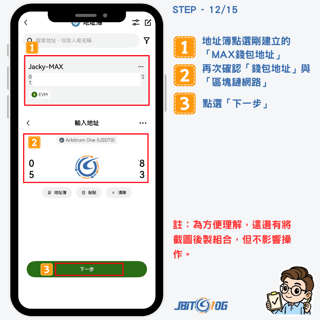 然後畫面會跳回地址簿,接著在點選剛才建立好的錢包地址,點進去後會跳出錢包地址資訊,請再次確認「錢包地址」與「區塊鏈網路」是否跟 MAX 交易所的一樣(不確定的話,可以再切回 MAX 確認)。確認資訊無誤後,就點選「下一步」。