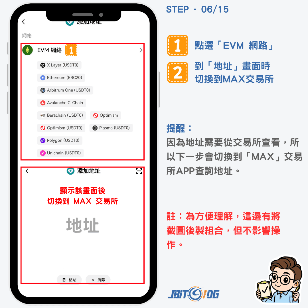 接著到區塊鏈網路頁面後,點選「EVM 網路」,然後當出現「STEP 6」下方的空白地址畫面後先停止在 OKX 交易所的動作,因為接下來需要到 MAX 交易所查看地址。